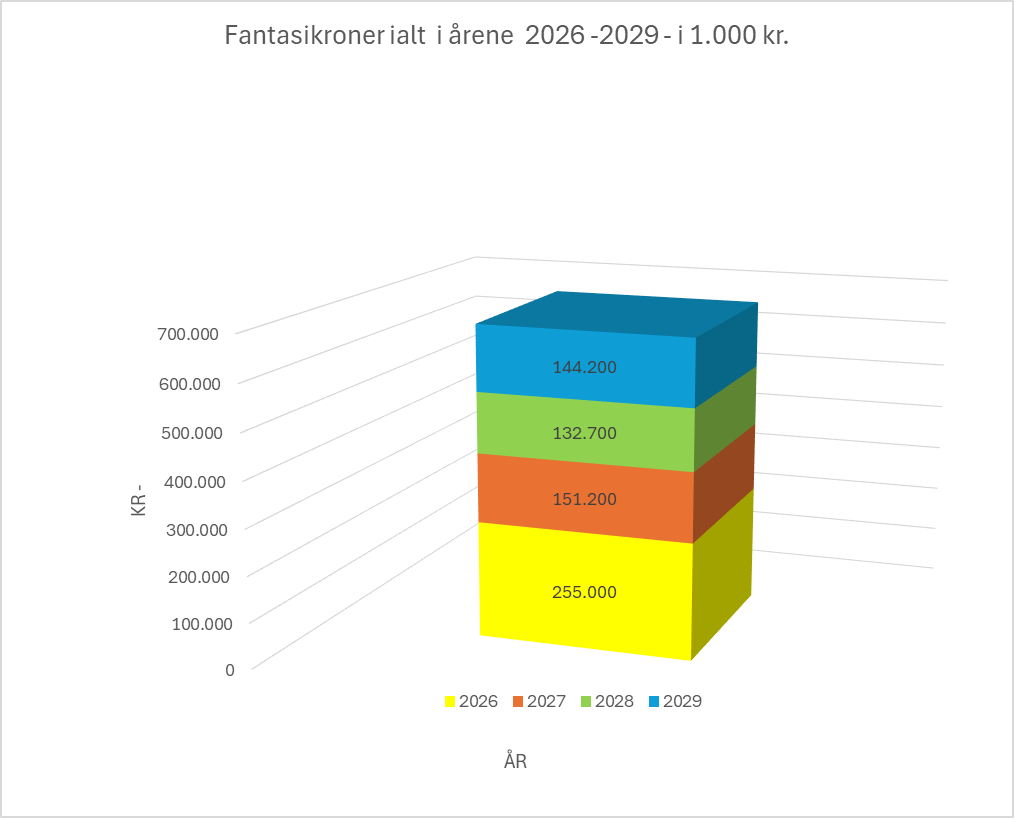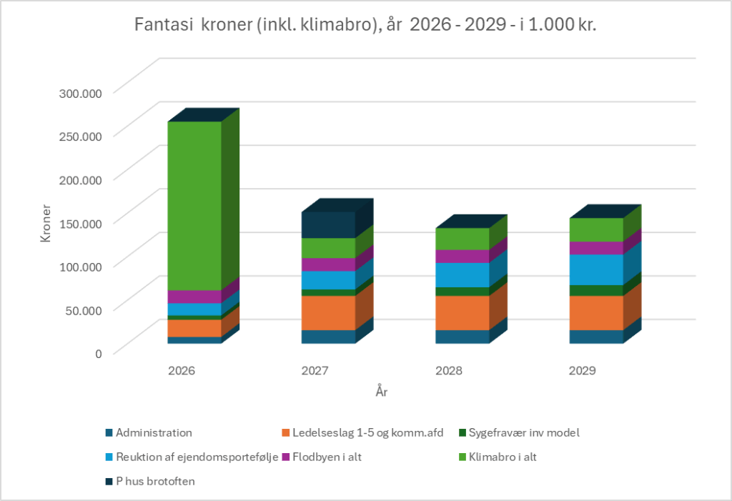 Administration, Reduktion af ejendomsportefølje, Klimabro, Ledelseslag 1-5 og komm. P-hus Brotoften, Sygefravær inv model, Flodbyen. I figuren fremgår hvor mange fantasimillioner de enkelte grupper udgør i hvert af de fire år.