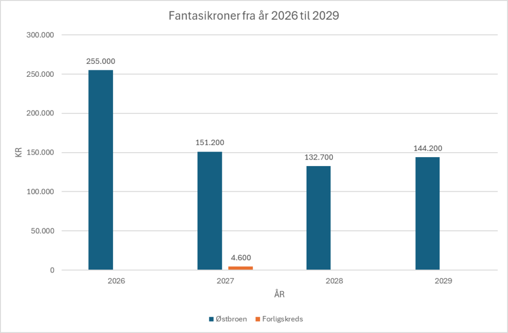 Af de to figurer ses, at Østbroen som nævnt ovenstående i alt bruger ca. 683 fantasimillioner i deres budget 2026 – 2029.